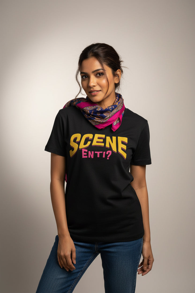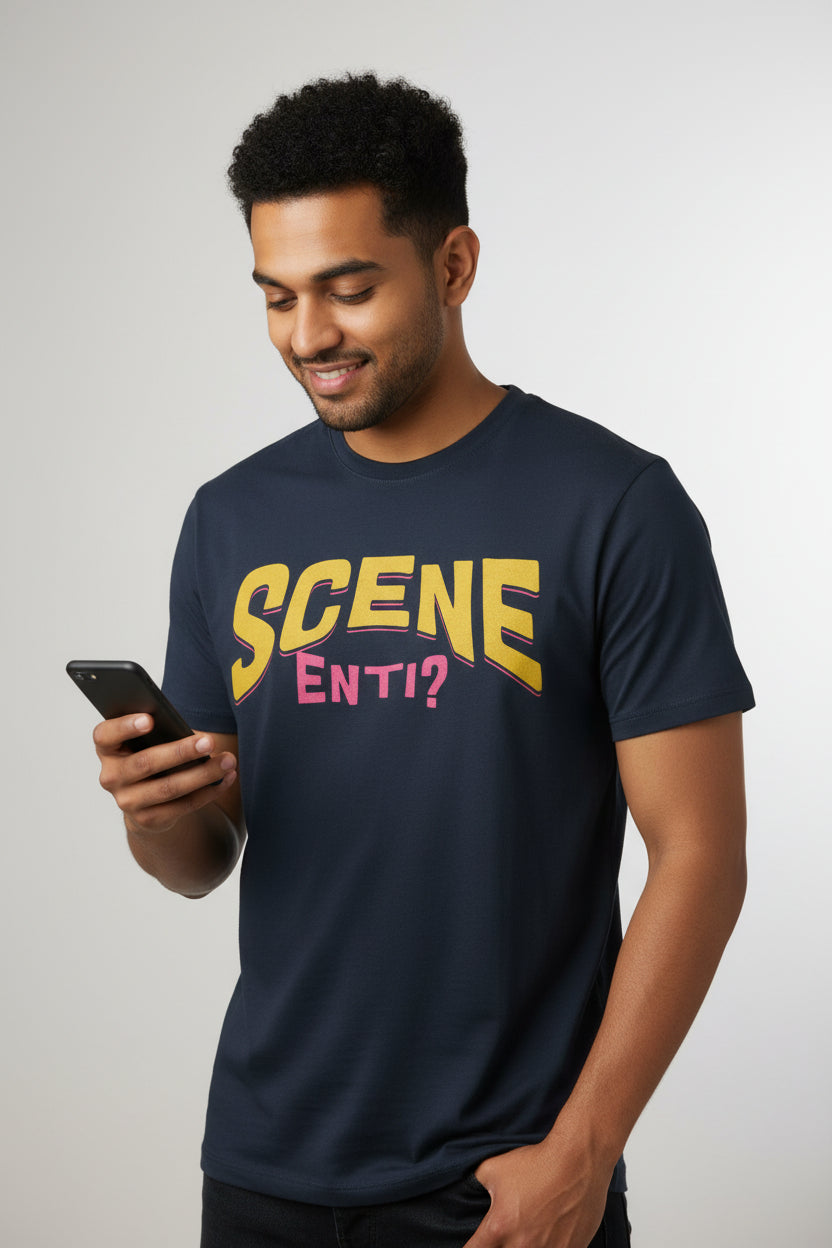Direct. Curious. Slightly investigative. “Scene enti?” is the universal Telugu opener. Weddings, cafés, standups, random street corners. Same energy.